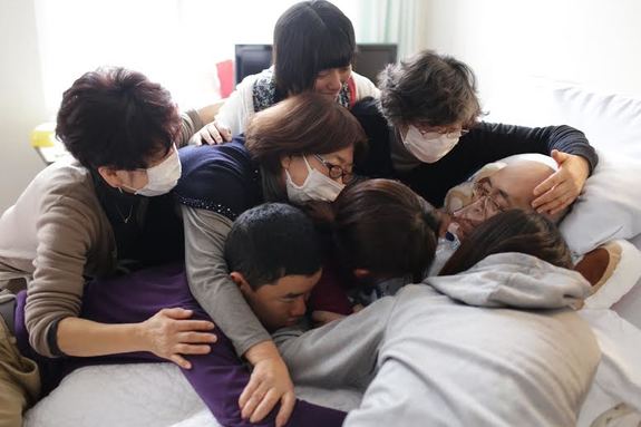 (亡くなられるおよそ30分前です。家族とがん患者さん、ボランティアスタッフとが最後の「だんごハグ」…最期を一人にしない)
