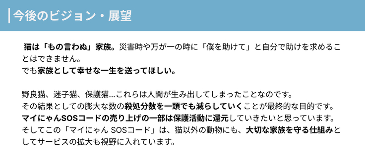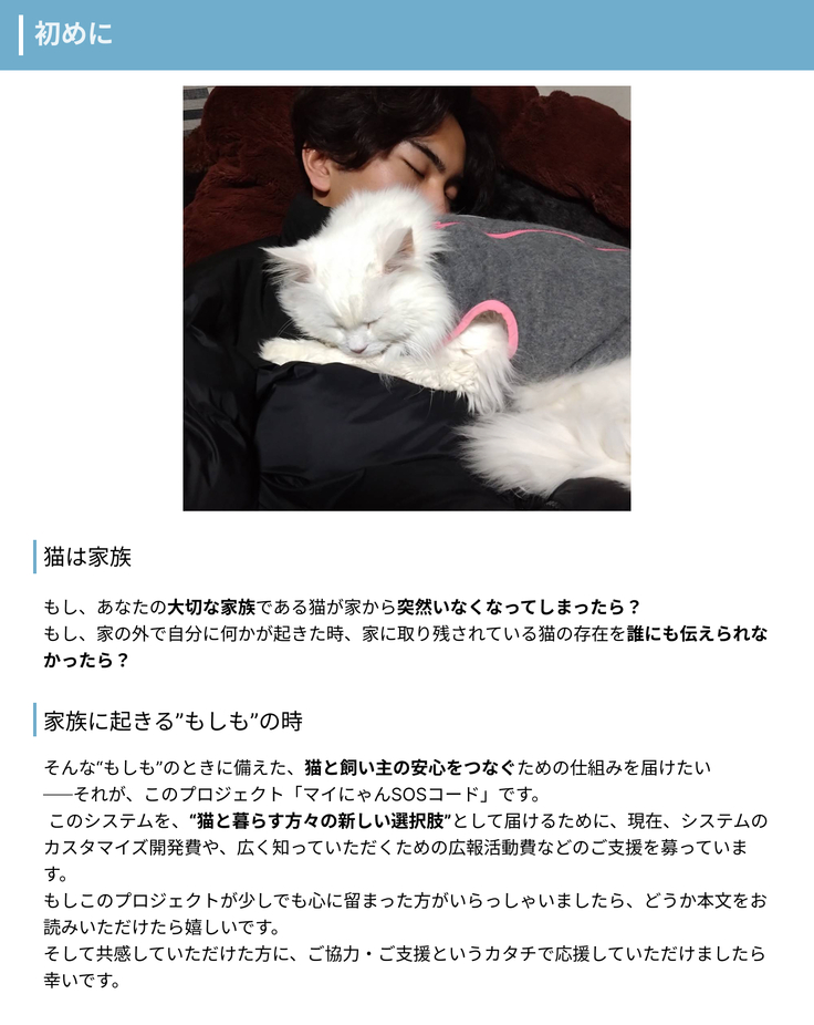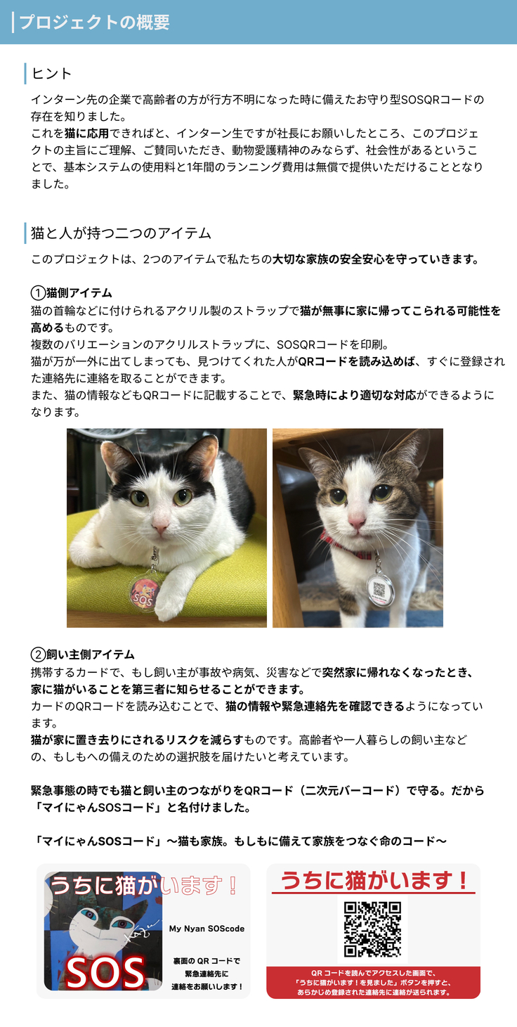 目標支援額は100万円です。 マイにゃんSOSコードのプロジェクトの立ち上げ、認知度向上を行っていくもので、2026年3月末までに終了予定。 システムに関してはインターン先の企業にご協力いただいております。 いただいた支援金は以下の用途で使用させていただきます。 Ready Forへの手数料 15,4000円 システムカスタマイズ費用 300,000円 サンプルストラップ制作費用 190,000円(100~200個程度) リーフレット等制作物デザイン、印刷費用 90,000円 プレスリリース配信費 (2回配信を予定)38,000 10,000円以上のリターン用スペシャル猫制作物作成費用 100,000円 雑費(営業用交通費、通信費等) 128,000円