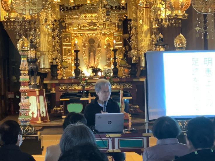 お話の中で、加藤巍山先生とシンポジウムをされたことがあると知り、初めて西山先生の偉大さを認識いたしました。しかし、それ以上に、お話をするうちに、ぜひ明恵上人についてご講演いただきたいという願いが募りました。帰宅後、インターネットで調べ、先生が並外れた方であることを改めて知ることとなりました。