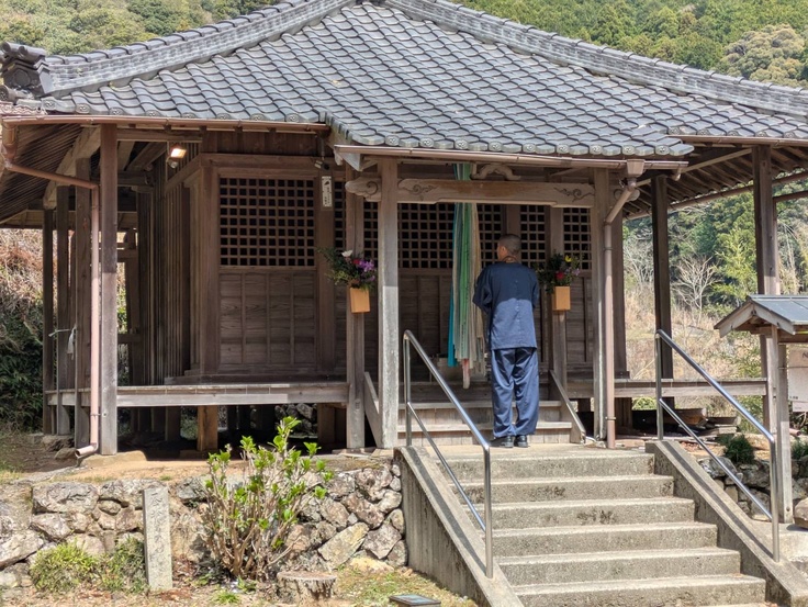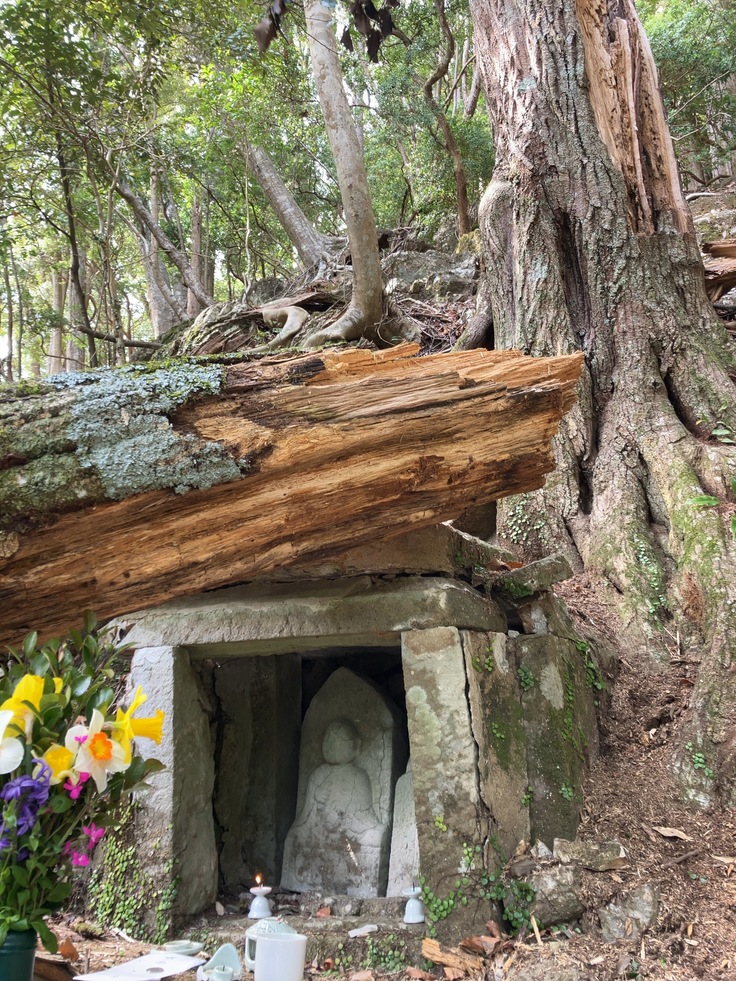 さらに山道を進むと、一人のご高齢の女性が私たちを温かく迎え入れてくださいました。八十八歳になられるその方の傍らには、共にこの地を守り続けてこられたお二人の姿がありました。この山奥の地には、もはや住む人もありませんが、それでもひっそりと祀られてきたお大師様の祠が、静かにそこに佇んでいました。倒木に押し倒され、危険な状態になっていた祠を前に、私たちは静かに手を合わせ、この地に宿る祈りの重みに深く心を打たれました。