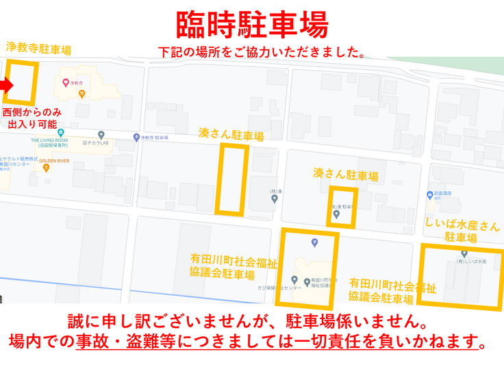 また、皆様のご厚意によりお借りしている駐車場ですので、節度あるご利用をお願い申し上げます。