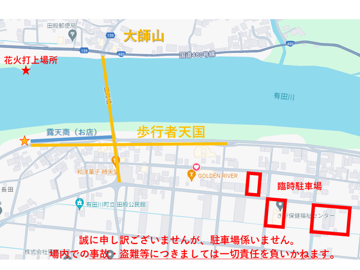 このたび、しいば水産様、湊選果場様、有田川町社会福祉協議会様のご厚意により、花火大会の駐車場としてご提供いただけることとなりました。