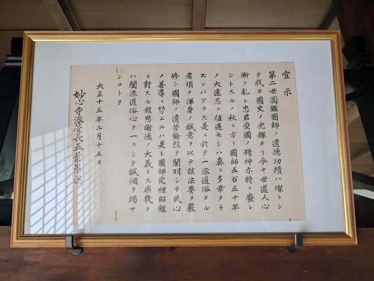上の写真は、100年前の微妙大師550年遠忌法要の際の、当時の妙心寺管長の宣示です。微妙大師の遠忌法要をとりおこなう意義が高らかに宣言されており、650年遠忌法要をとりおこなう私たち妙感寺の住職、檀家も同じ気概をもって臨んでおります。