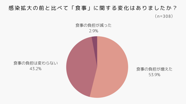 本プロジェクトの発足に際し、食卓事情に関するアンケート調査を実施しました。その結果、回答者の5割強がコロナ感染拡大前と比べて「食事の負担が増えた」と回答しました(n=166)。