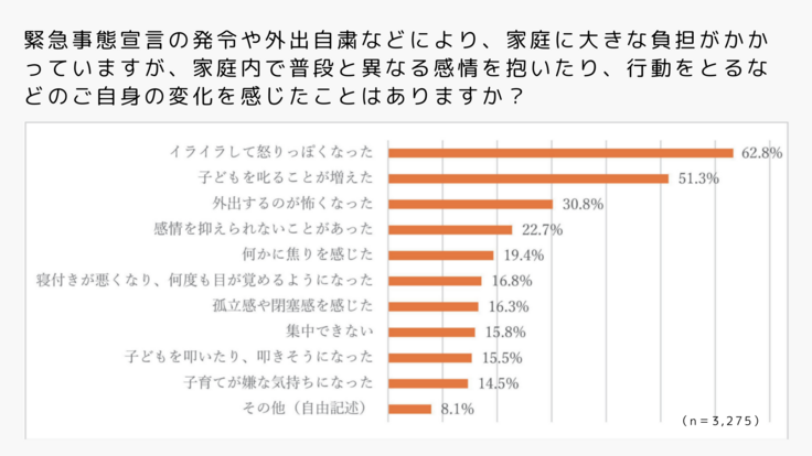 また、コロナ禍で在宅勤務が拡大したことなどから、親にとって、子どもと一緒に過ごす時間が増えたりとプラス面もあった一方で、メンタルヘルスの問題が懸念されています。