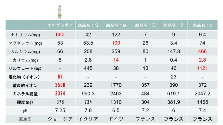 炭酸水成分比較表(1000ml当たりの比較)