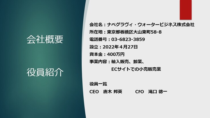 初めまして、ナベグラヴィ・ウォータービジネス株式会社の代表を務める唐木と申します。
