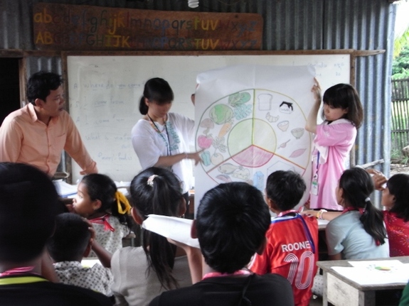 iii) 1日の食事を通して、赤のグループ・黄色のグループ・緑のグループそれぞれに含まれるいろんな食品を選んで食べるようにすることで、栄養素をバランスよくとれることができると伝える。また、とくに緑のグループに含まれる食品は、体の調子を整え他グループの食品の効果を促進させることができるため、多めにとるように心がけることを伝える。いくつかの食べ物のイラストをひとつずつあげ、それぞれどの栄養素に含まれるかを当ててもらう。(プリントや模造紙を参考にして子どもたちが推測できる食材を用いる)