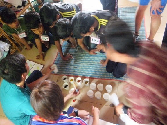 子どもたちに水の入った紙コップを配り、内ひとつ(もしくはふたつ)は水の代わりにHIVを模したオブラートを入れておきます。