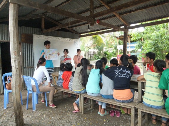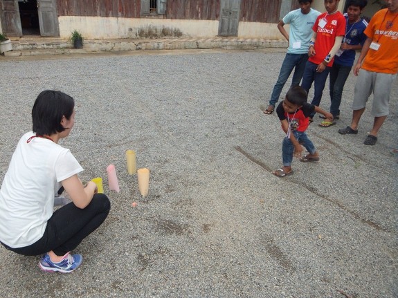 他にも、紙芝居(もも太郎)、オンコンニュ(カンボジア伝統の遊び)・手つなぎ鬼などを行いましたが、中でも一番盛り上がったのはオンコンニュ。オンコンニュは通常、オンコンという実を使って行う遊びなのですが、なかったため画用紙で作ってしまいました。それでも、子どもたちは楽しそうに遊んでくれていました。