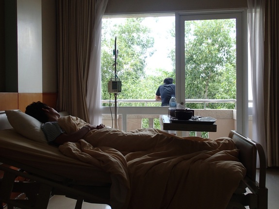 ↑病院にて、アメーバ赤痢による激しい苦痛のために寝込む私(笑)