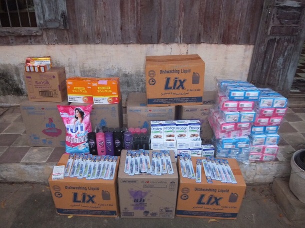 右から、生理用品・食器洗う洗剤・固形石鹸・歯ブラシ・シャンプー・洋服用洗剤です。