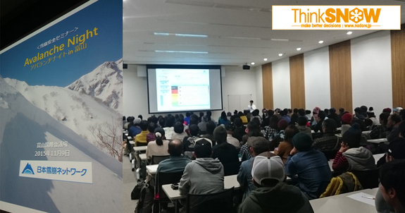無料の雪崩安全セミナー「アバランチナイト」の開催が各地で始まりました。今年は松本市(11月7日)、長野市(11月8日)、富山市(11月9日)と信州・北陸からのスタートとなり、早速、多数のご来場を頂きましてありがとうございます。