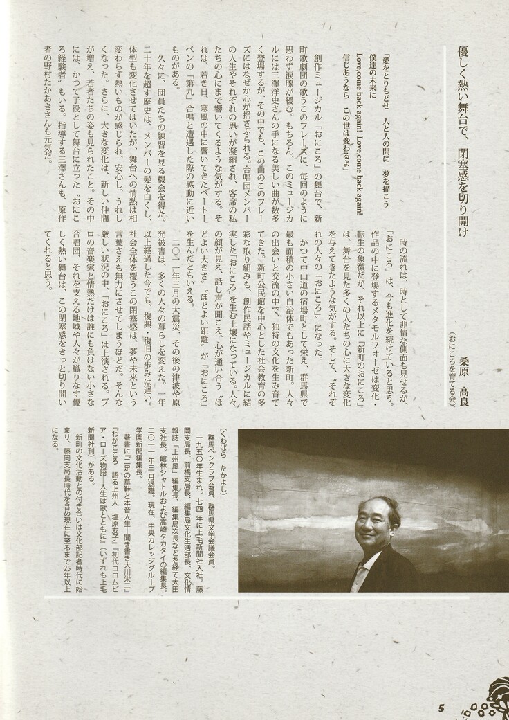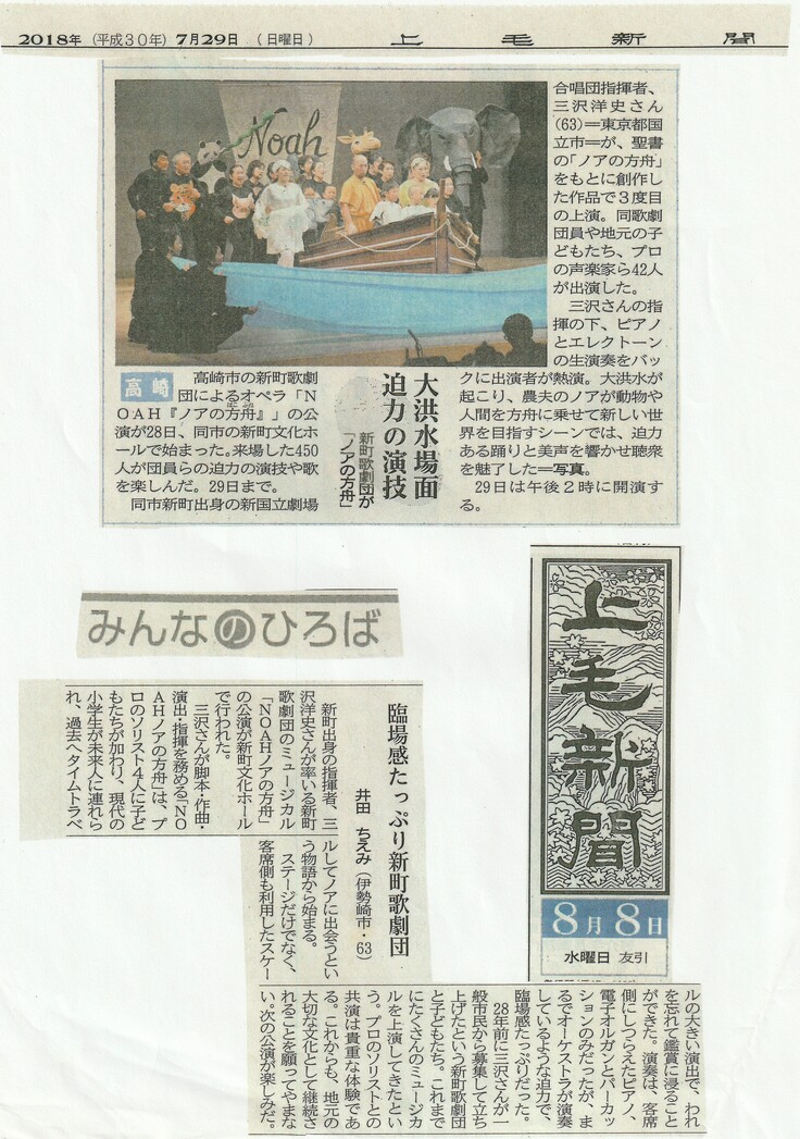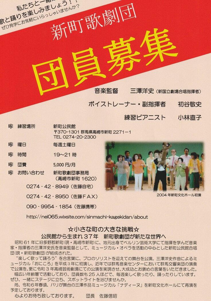 オペラ・ミュージカル活動 2015.08.23(日) 三澤洋史ミュージカル「おにころ」主催・出演 群馬音楽センター 出演者数 26名 2016.07.23(土), 24(日) 三澤洋史と世界の仲間たちによるコンサート「魔笛」新町文化ホール 出演者数 27名 2017.07.30(日) 三澤洋史ミュージカル「おにころ」主催・出演 群馬音楽センター 出演者数 25名(十おにころ合唱団6名十子役15名) 2018.07.28(土), 29(日) 地球オペラ「ノアの方舟」主催・出演 新町文化ホール 出演者数 25名(十子役11名) 2021.07.25(日) 三澤洋史ミュージカル「おにころ」主催・出演 高崎芸術劇場 出演者数 25名(十おにころ合唱団6名十子役15名) 2022.08.07(日) 三澤洋史 子供ミュージカル「おにっころの冒険」高崎市文化会館 出演者数 25名