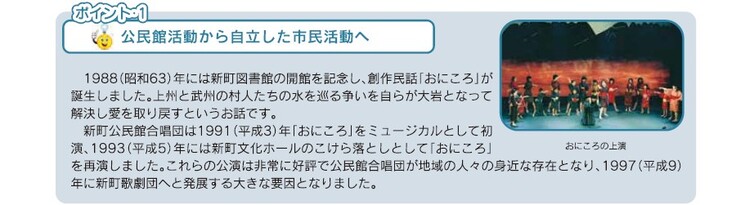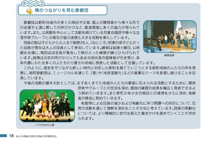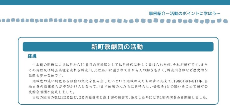 また、私たち新町歌劇団の活動は、生涯学習の観点からも注目されています。高崎市生涯学習推進協会の『私たちが創る「地域力を育む生涯学習社会」活動のてびき』の中に事例紹介されています。