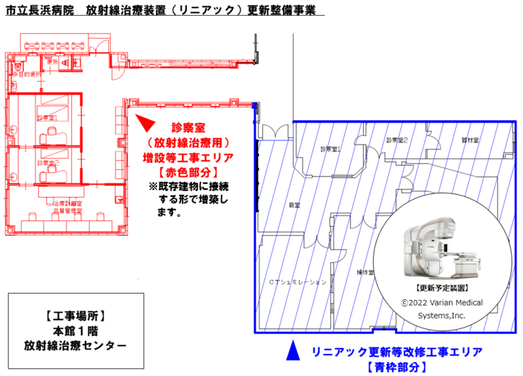 市立長浜病院がリニアック更新整備事業を実施します。 今回ご支援いただいた寄付金は、リニアック整備事業(付属工事および診察室増設工事)経費支払の一部に充当します。帳簿上の充当先は、会計処理の都合上、診察室増設工事費用となります。