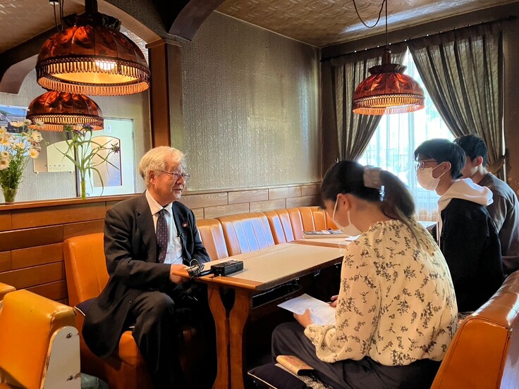 県内被爆者運動の草創期からの足取りを中心にお話を伺いました。メンバー5名(大学生2名含む)で聞き取りをさせてもらいました。場所は長野県の被爆者運動の歴史ともいえる松本市の食堂「ピカドン」をお借りすることができました。