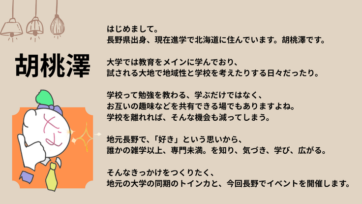 長野県出身の現役大学生2人組が、地元長野で“雑学以上、専門未満。”をコンセプトに、誰かの「好き」から学びへ繋がるイベントをつくります!!