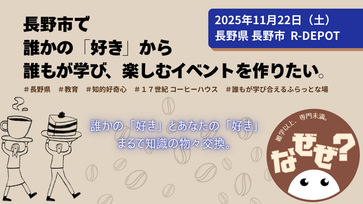 そして、いつかは、今回我々【 なぜぜ? 】がイベント化したこのような場が、自然発生的に長野市に限らず、松本市や県内各地、県外、色々な場所で所属、学歴や身分関係なく、誰もが カップ1杯から 知的好奇心を満たせる機会に出会えることを望んでいます。