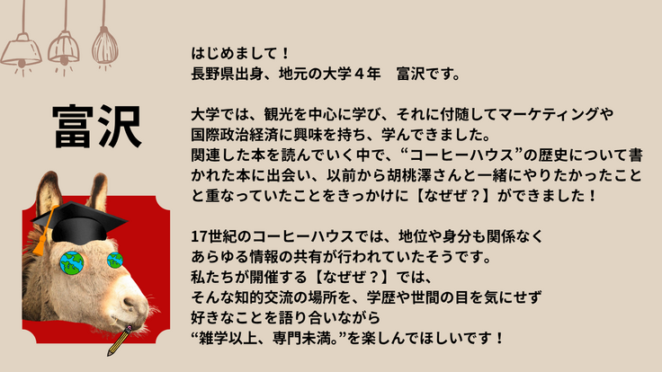 ※プロジェクトとリターンは、『雑学以上、専門未満。【なぜぜ?】』運営メンバーである胡桃澤と富沢が実施します。