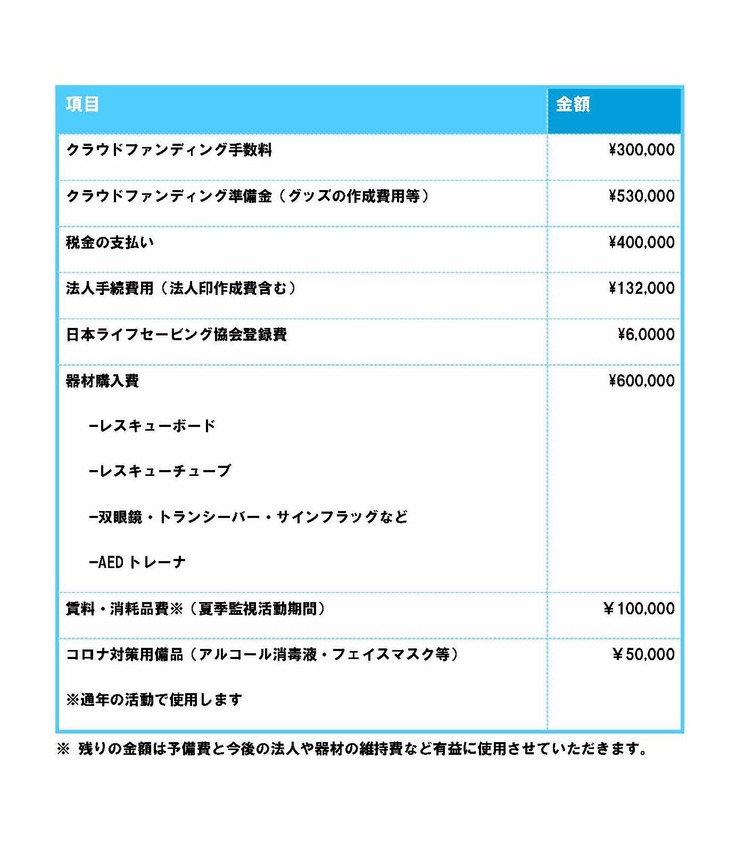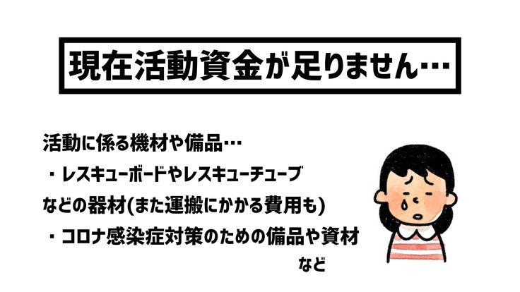 ライフセービングクラブを立ち上げるための、主となる長崎県ライフセービングクラブ協会の法人登記費用や、日本ライフセービング協会の登録費なども個人で支払っていたため、現在あまり資金がありません。
