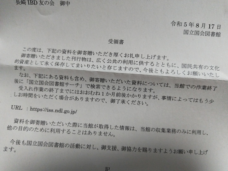 kindleで個人出版した「潰瘍性大腸炎を患った15歳少年の現在」を国会図書館に献本し、受領されました!長崎IBDの活動記録として後世に継承されます。