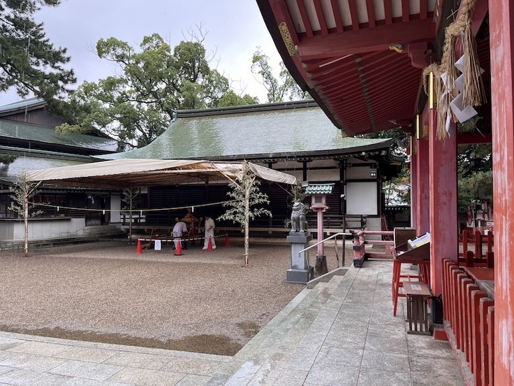 開始前、雨が強く降ってきた事もあり、御神輿が待機している大きなテント内に避難して、御神事もそこで執り行われました。