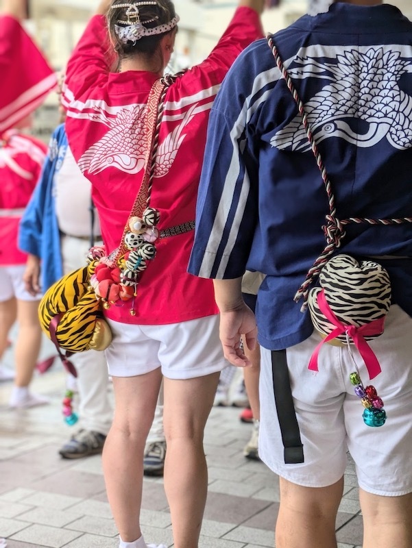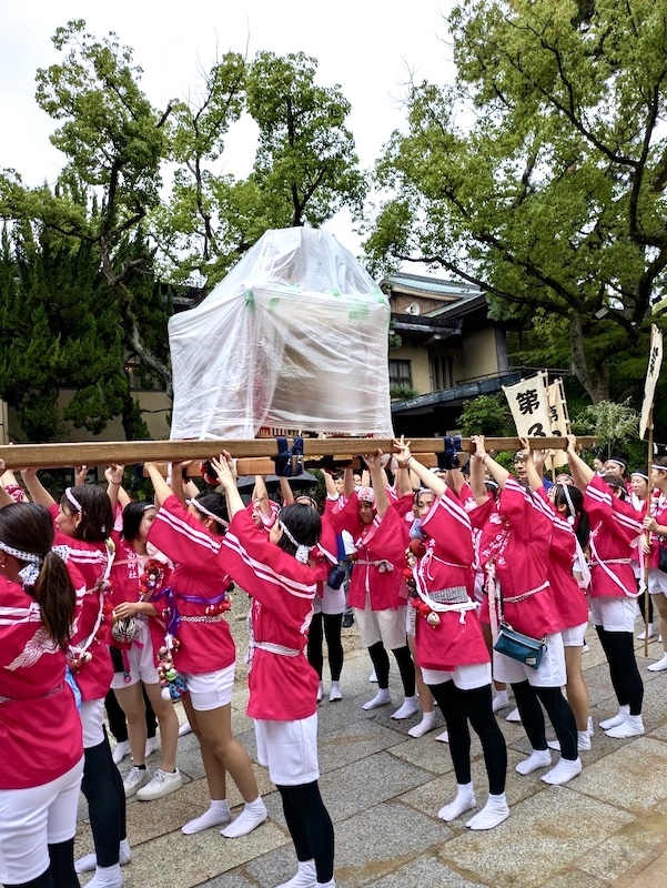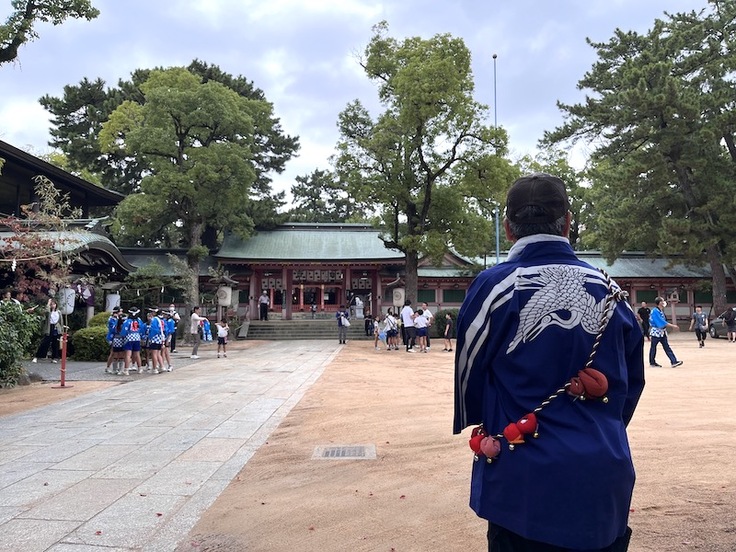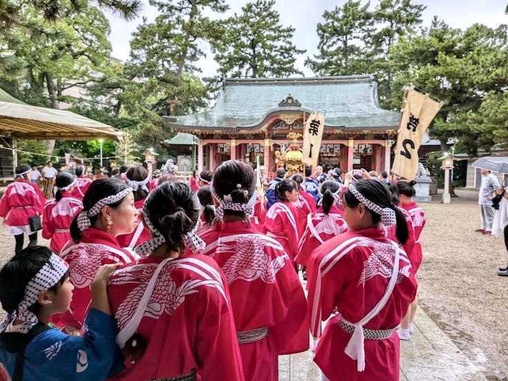 前日に実物を確認した時は、めっちゃかわいいなあ……と思ったのですが、実際に渡御をしていた時の風景写真を見ると、この明るくて透明感もあるストロベリーレッドのはっぴが、曇天の空の下、最高に元気いっぱいで美しかったし、長田の街に晴れやかな "力" を振りまいていたんです。