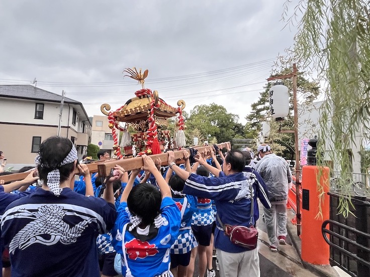 神社前の『八雲橋』を渡る時は、御神輿を上げっぱなしです。川を渡る様子の再現で、神様を濡らさないようにするために持ち上げさせていただきます。