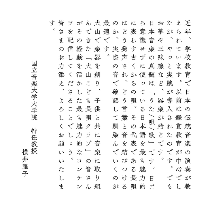 この度、学校教育現場で唄指導がの大切さについて現況を加えお示し頂きました。