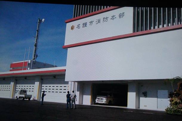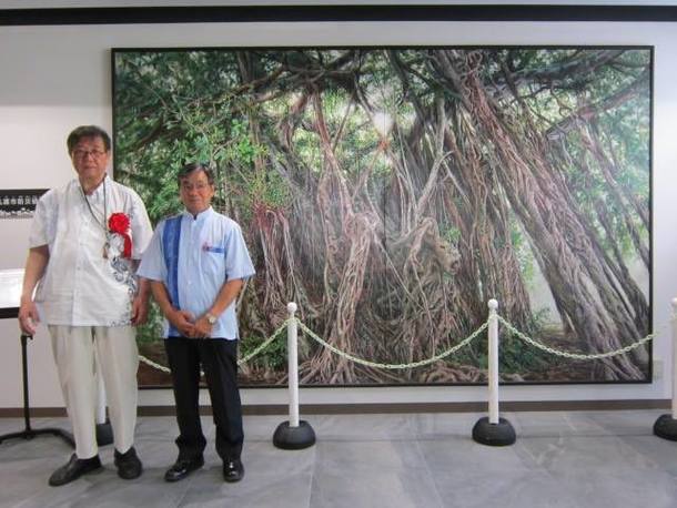 私たちが寄贈したガジマルの絵は、6月28日の名護市消防本部新庁舎の落成式の際に披露されました。この庁舎の正面玄関から入った正面の壁面にあります。誰でも自由に出入りできます。最初の写真は消防本部の全景です。絵の前のお二人は市長と橋本代表です。