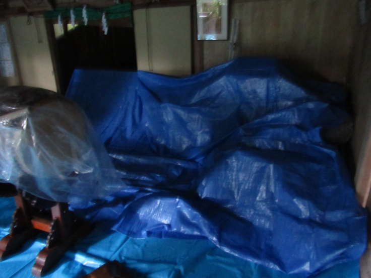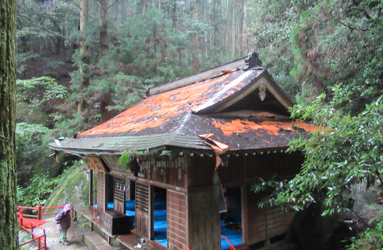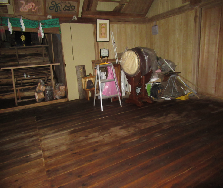 後日雨の止むのを待って、業者に屋根にシートを被せてもらい、拝殿は数日間引き戸を開放して湿気を取り除くよう努めましたが、天井や床等は修復を要する状態になってしまいました。幸いにも本殿の中に祀られていた木造の像は雨水に打たれることはなく無事でしたが、これらの被害により当神社では、物理的にも精神的にも大きな損害を受けました。