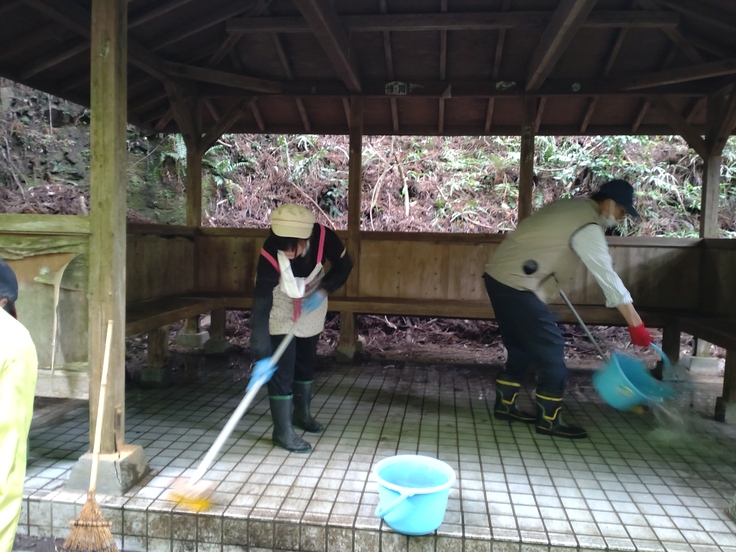 お社付近の休憩所が清掃活動のいつものゴールです。かなり朽ちてまいりましたが、お詣りにいらした方がお休みになられている姿を見ると、やっぱり手入れは必要です。