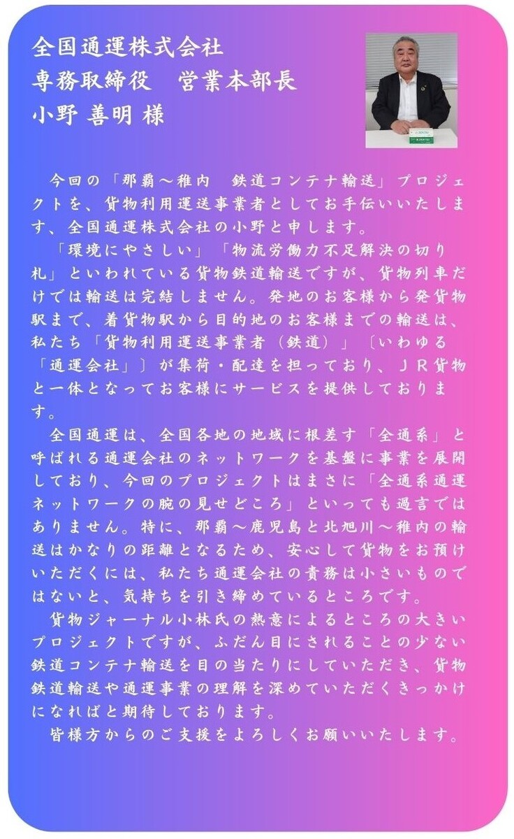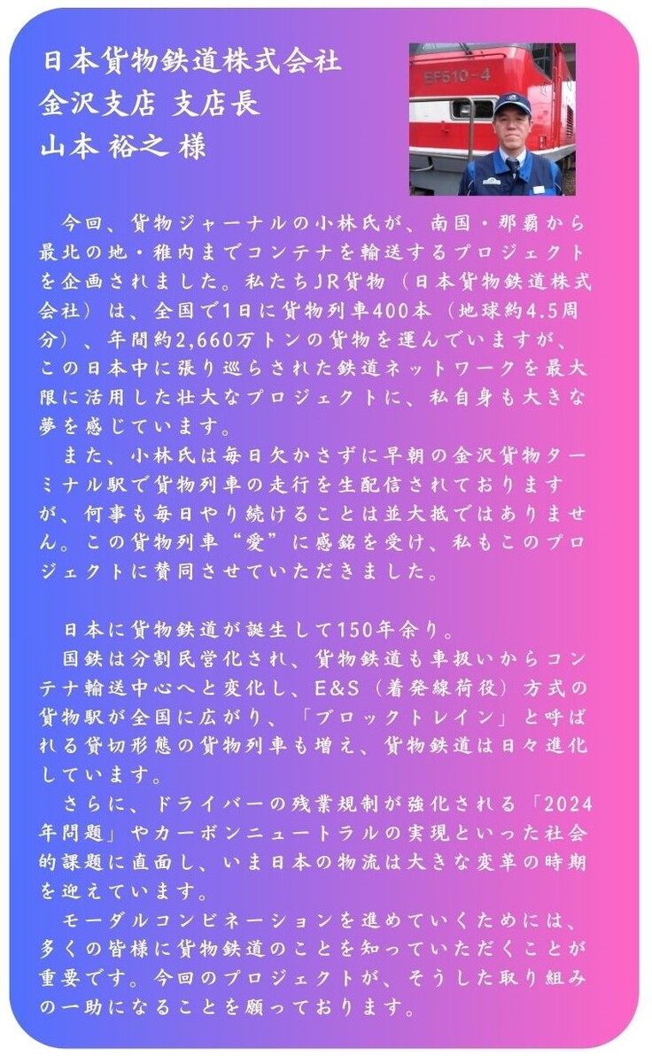 ※本プロジェクトは、JR貨物様及び全国通運様から、プロジェクトを行うこと、及び社名の掲載をさせていただくことの承諾を頂いております。