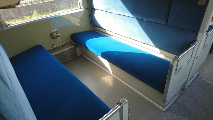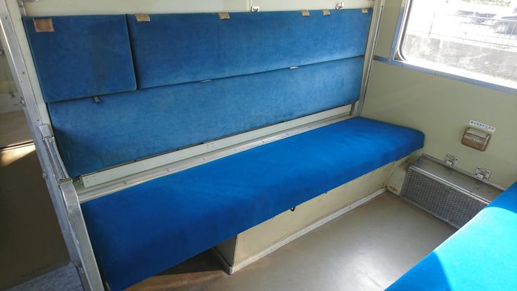 今回の工事では車内の修繕は予定しておりませんでしたが、施工していただいた 司機工株式会社 の代表取締役副社長、山本昇一郎様のご厚意により、国鉄青モケット(生地)に破れがあったシート2脚もきれいに張り直していただきました。本当にありがとうございます。
