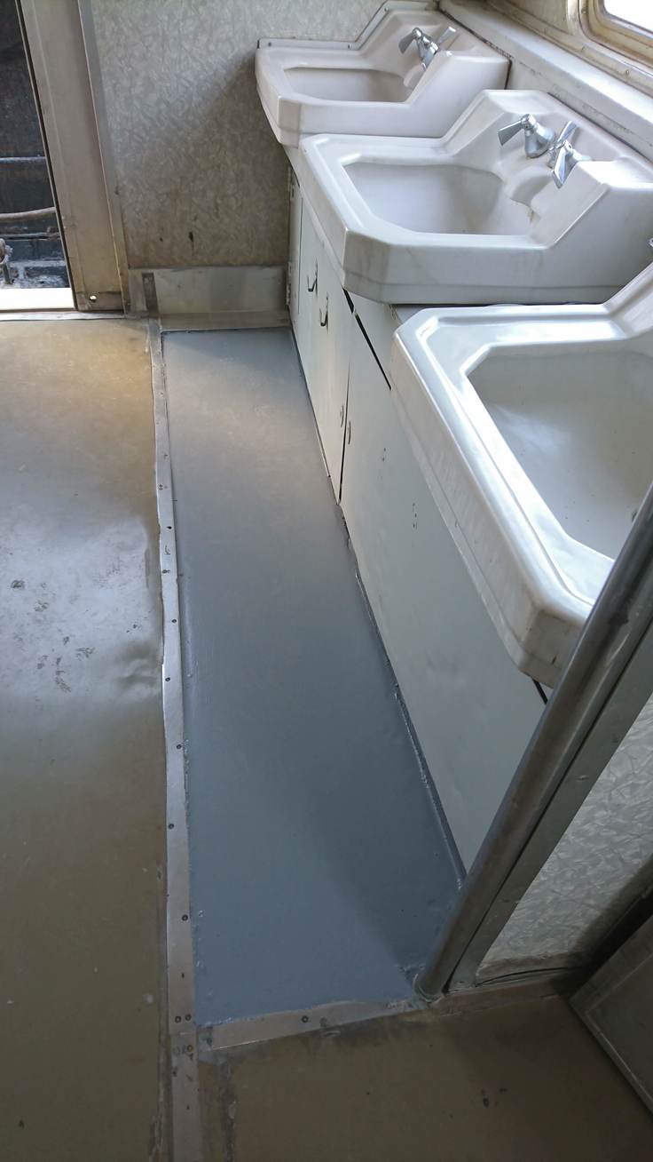洗面台前の床部分も、きれいに塗り直していただきました。こちらも、当初の工事予定になかったもので司機工株式会社様のご厚意によるものです。ありがとうございます。