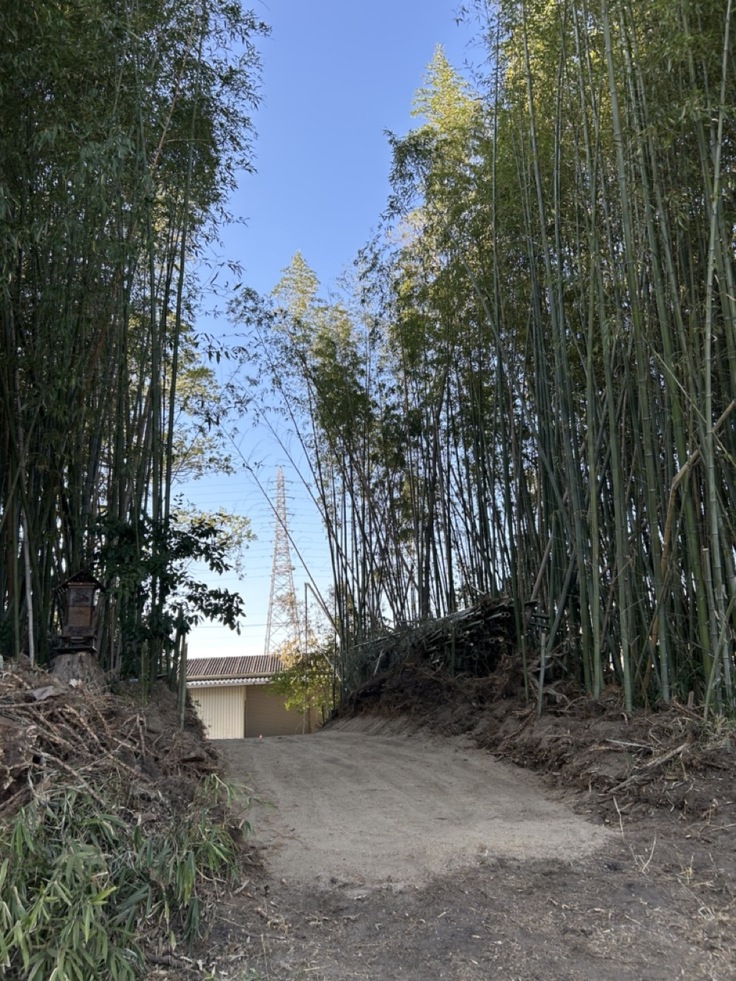 北側の竹や樹木が伐採され、竹林の一部に空間ができました。高低差があるためある程度ならしたあと、鉄板を敷いて整備されました。
