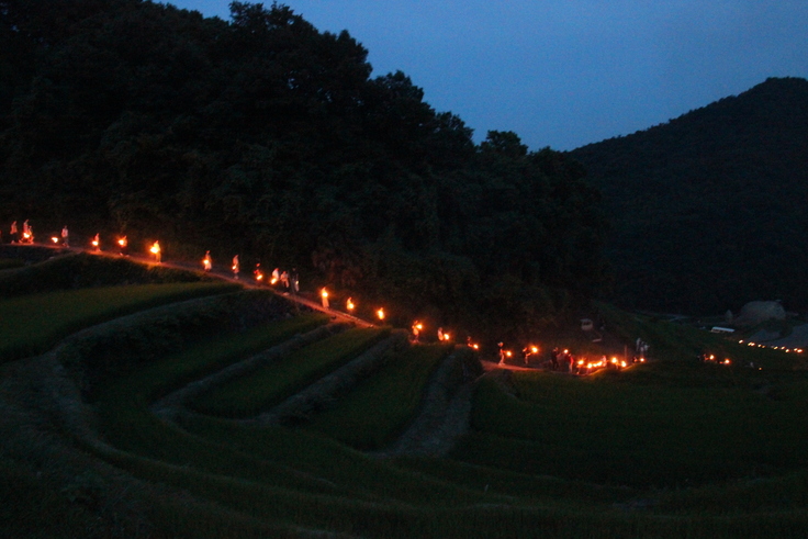 「とーもせ、灯せ。」の声をかけながら、火手(ほて)を持ち、青々とした稲が育つ棚田の畦道を歩きます。真っ暗の中、列をなした火手の光がゆらゆらと揺らめきながら動いていく風景はとても幻想的です。