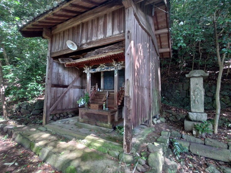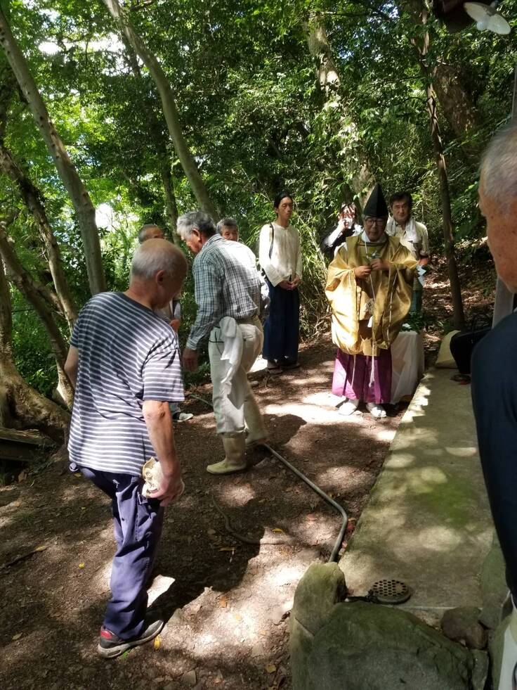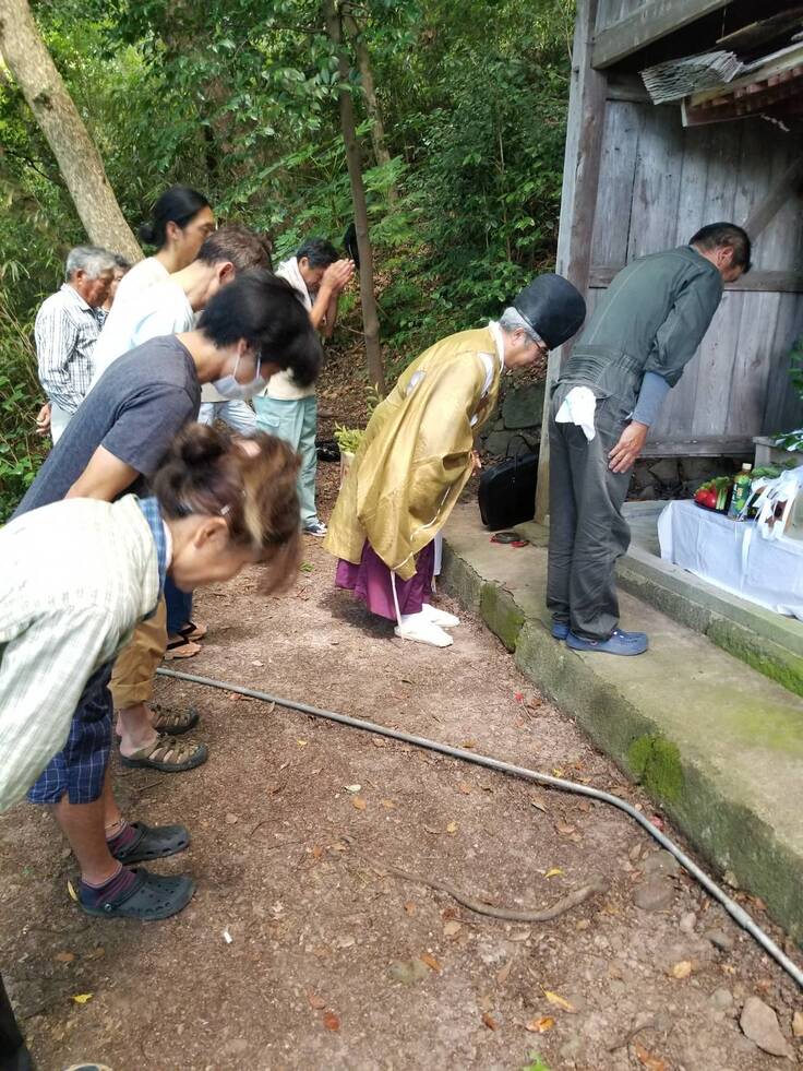 先週の日曜日(8月6日)島四国八十八か所霊場、第四十四番札所 湯舟山蓮華寺境内にある、熊野権現神社の例大祭がありました。午前10時に中山自治会の役員が出席し、神事が行われました。