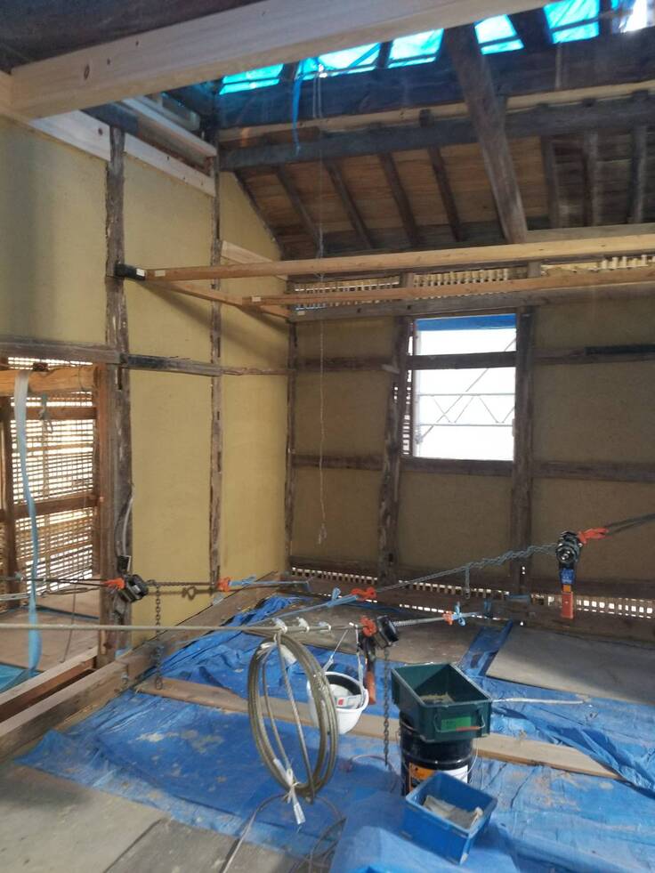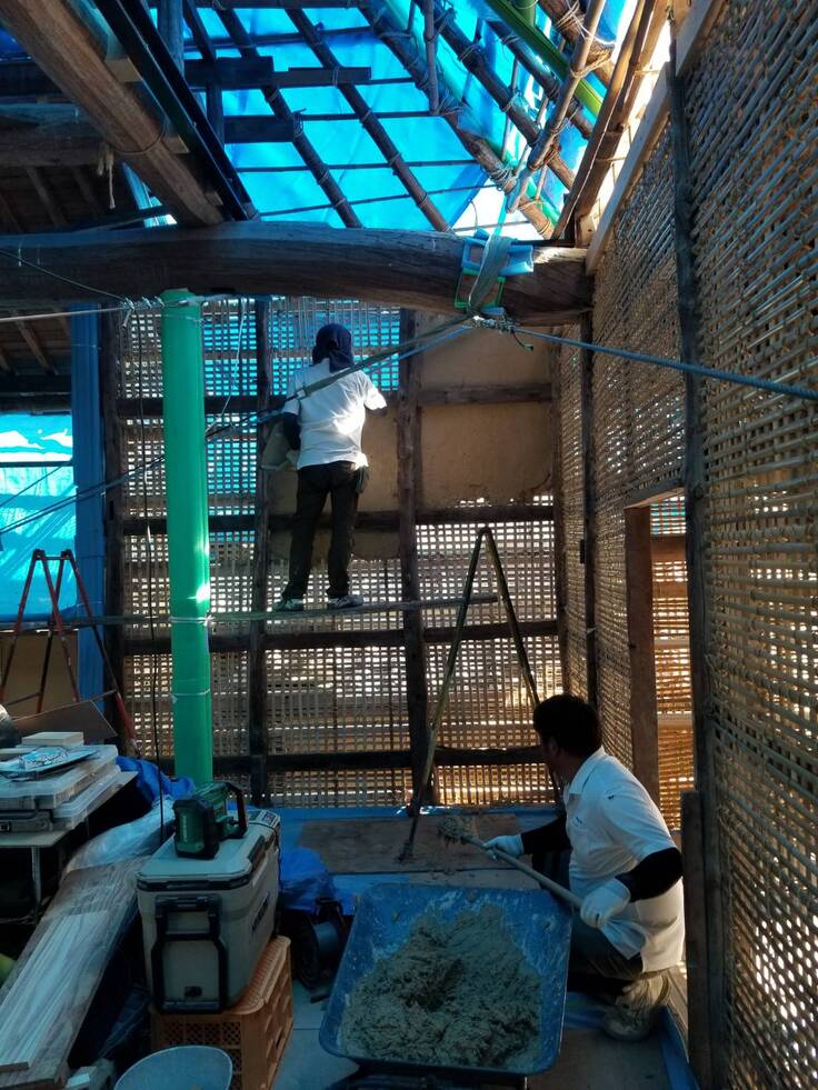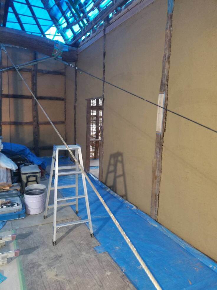 土壁塗りの第一段階終了後、数日間おいて第二段階、第三段階の土壁塗りの作業を行う予定となっているそうです。壁が入ると建物の雰囲気が一変しますね。これからも工事の状況をお知らせしていきたいと思います。