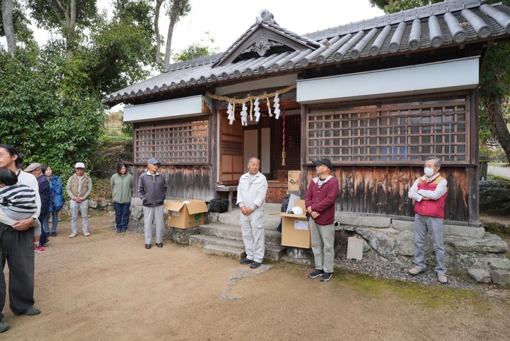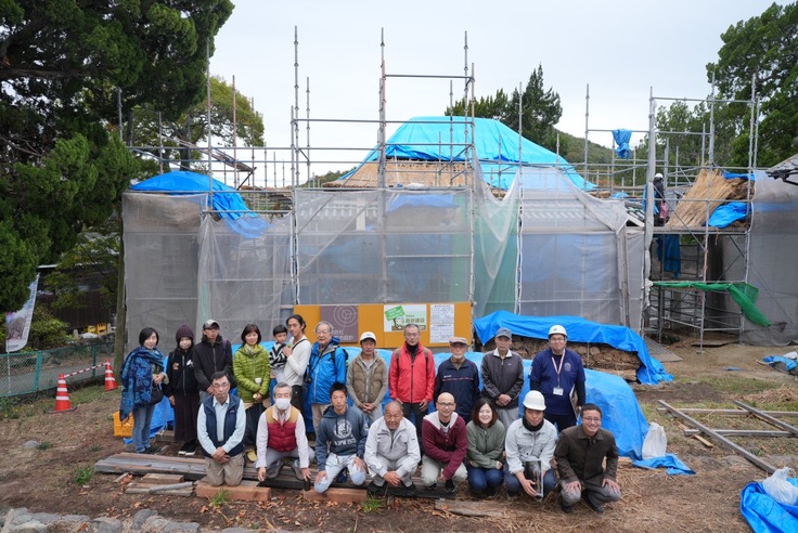 ご無沙汰しております。中山自治会です。本日午前10時より、クラウドファンディングEコース(工事中の舞台見学ツアー)にてご支援頂いた方々をお招きして、茅葺き工事を始めとする工事中の舞台見学ツアーを実施致しました。時折雨がぱらつくあいにくのお天気となってしまいましたが、雨の合間を縫って、見学ツアーを何とか無事に行う事が出来ました。