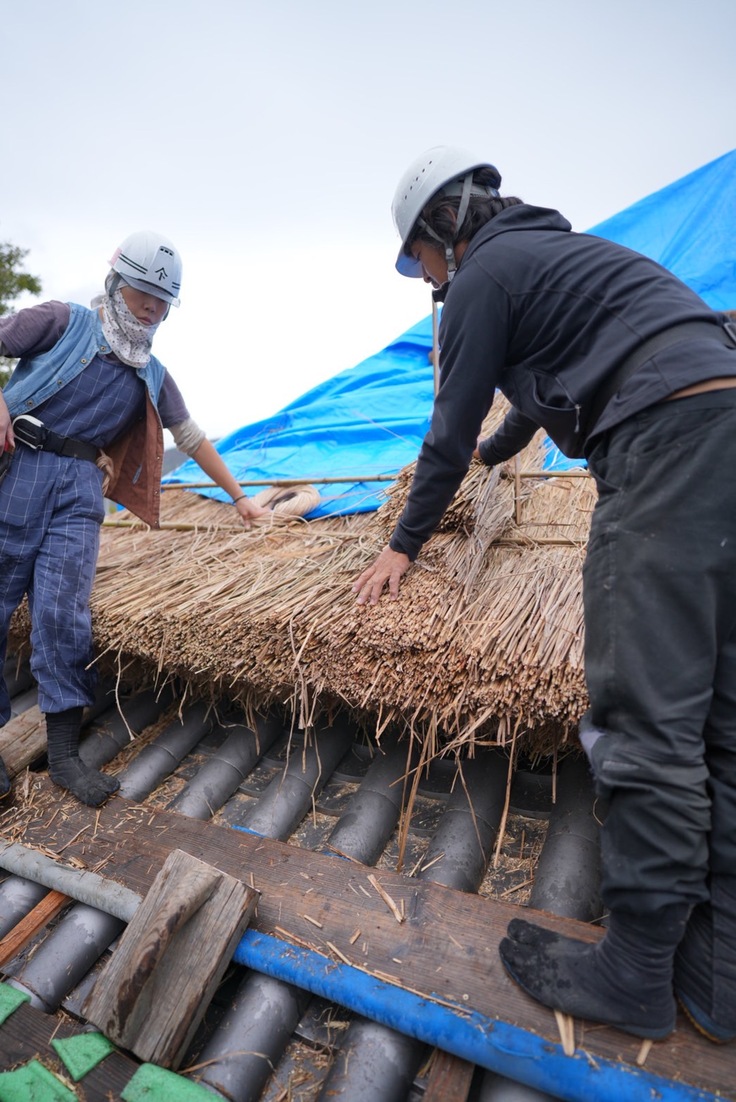 秋田県から来てくださっている佐藤茅葺き店の茅葺き職人さんが、このツアーのために特別に茅葺きの道具や工法などの説明をしてくださいました。