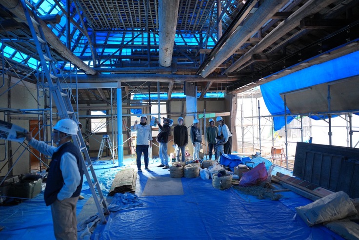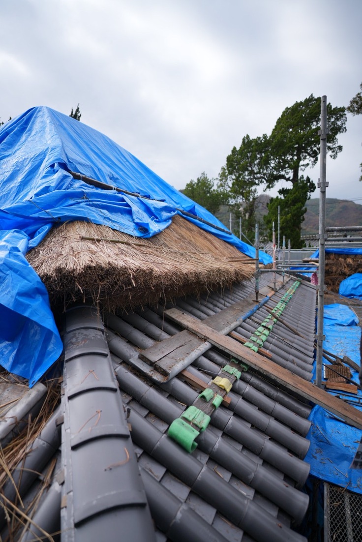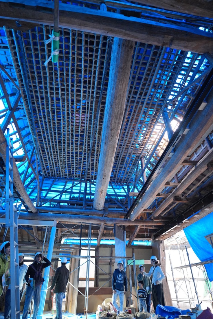 茅葺き工事現場の足場には一度に乗れる人の人数制限があるため、3つのグループに分かれての見学となりました。茅葺き屋根の工事は先日始まったばかりで、今現在、屋根最下部の茅が葺かれた状態です。