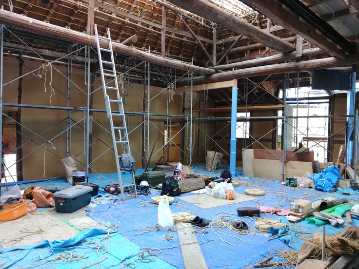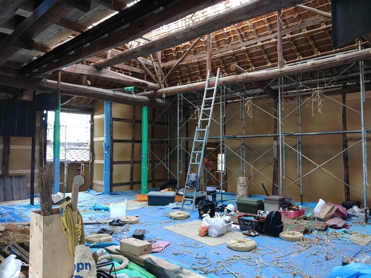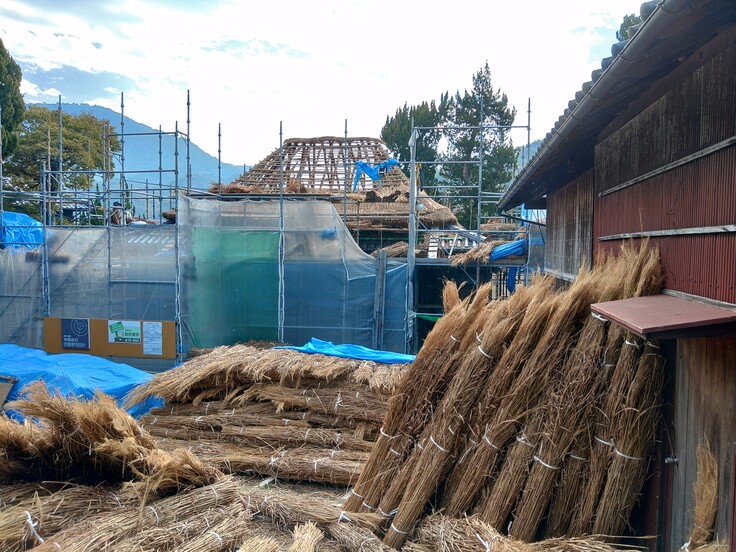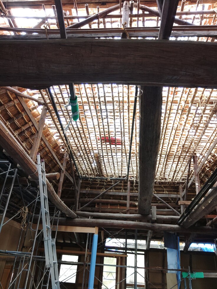 先日の舞台見学会直前に始まった茅葺き工事が徐々に進んでおります。