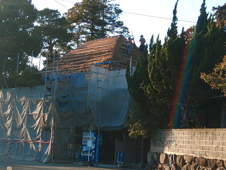 茅葺き作業も最上部まで終わり、屋根の最上部の雁振瓦(がんぶりがわら)も設置されました。この後は上から屋根の形を整えていき茅葺き屋根の完成となります。