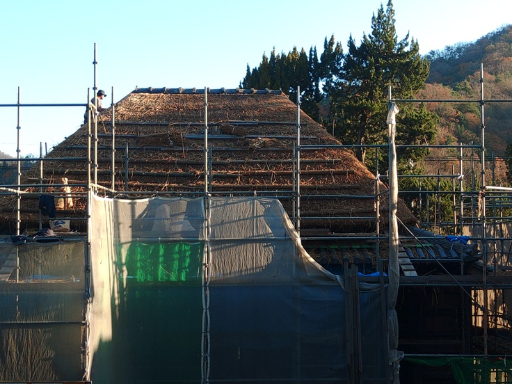 舞台正面から見た茅葺き屋根。上部だけ見ても綺麗に整えられている事がわかります。出来上がりが楽しみです。
