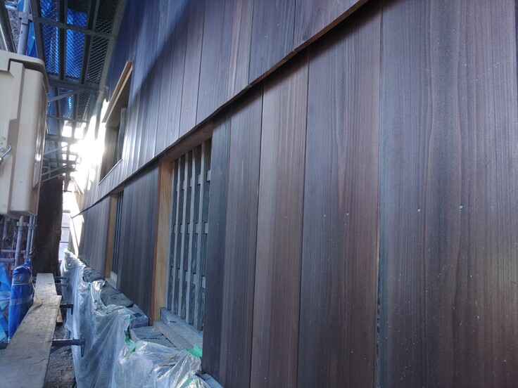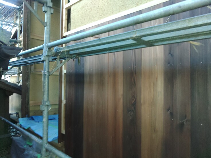 真新しい杉板の壁になり、改修前とは随分印象が変わります。足場が撤去された時どんな感じになっているのか、見るのが楽しみです。