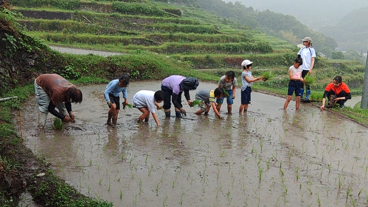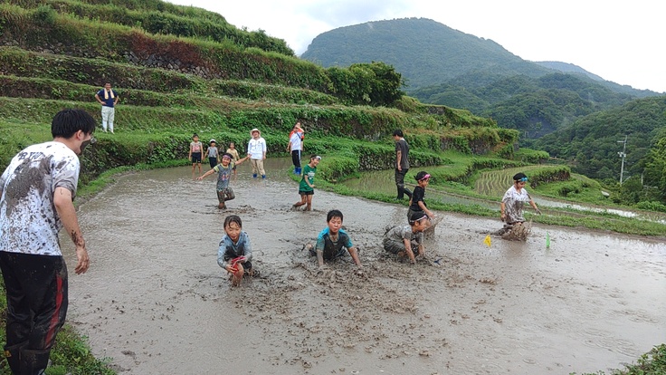 地元の池田小学校児童を迎えて田植え体験&どろんこ遊び。