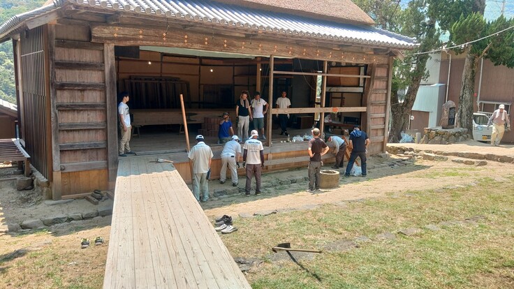 本年の奉納歌舞伎本番まで二か月を切りました。中山農村歌舞伎保存会では、本日午前8時半より舞台開きの作業を行いました。30℃を超える猛暑の中集まったメンバーは慣れた手つきで作業を進めていきました。毎回、力任せに外していた舞台前面の戸板も拍子抜けするくらいすんなりと外れ、舞台はどんどん開いていきます。