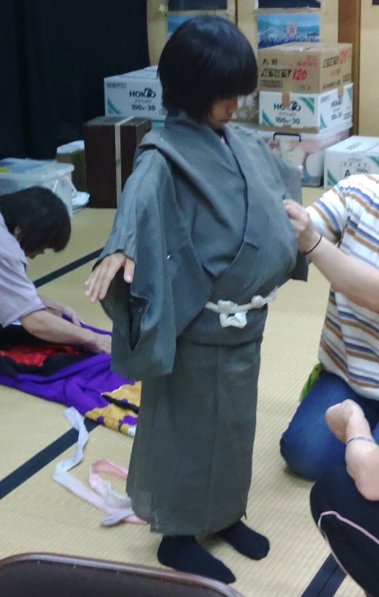 先日は衣裳方さんが集まって衣裳の着付けも行われ、各役者の体格に合わせた調整作業も行われました。下の写真の着物は元々大人用の物。裾や袖の長さの調節が大変そうでしたが、これをどう着こなすか。本番の衣装にもご注目ください。